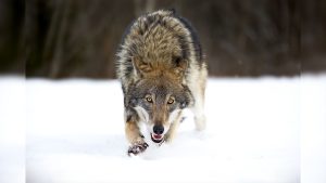 Closeup of a grey wolf in a forest covered in the snow in Belarus by wirestock
